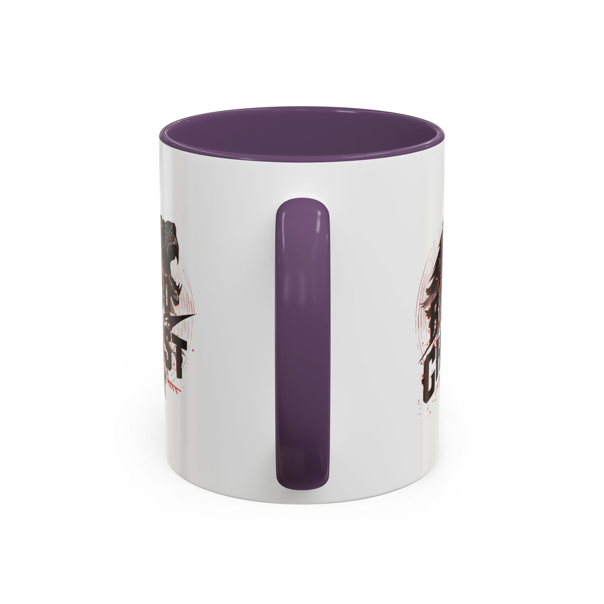 This ceramic accent mug brings heart and edge to each morning ritual. A bold, hand-inked wolf and distressed lettering sit against a glossy white canvas, while the contrasting coloured