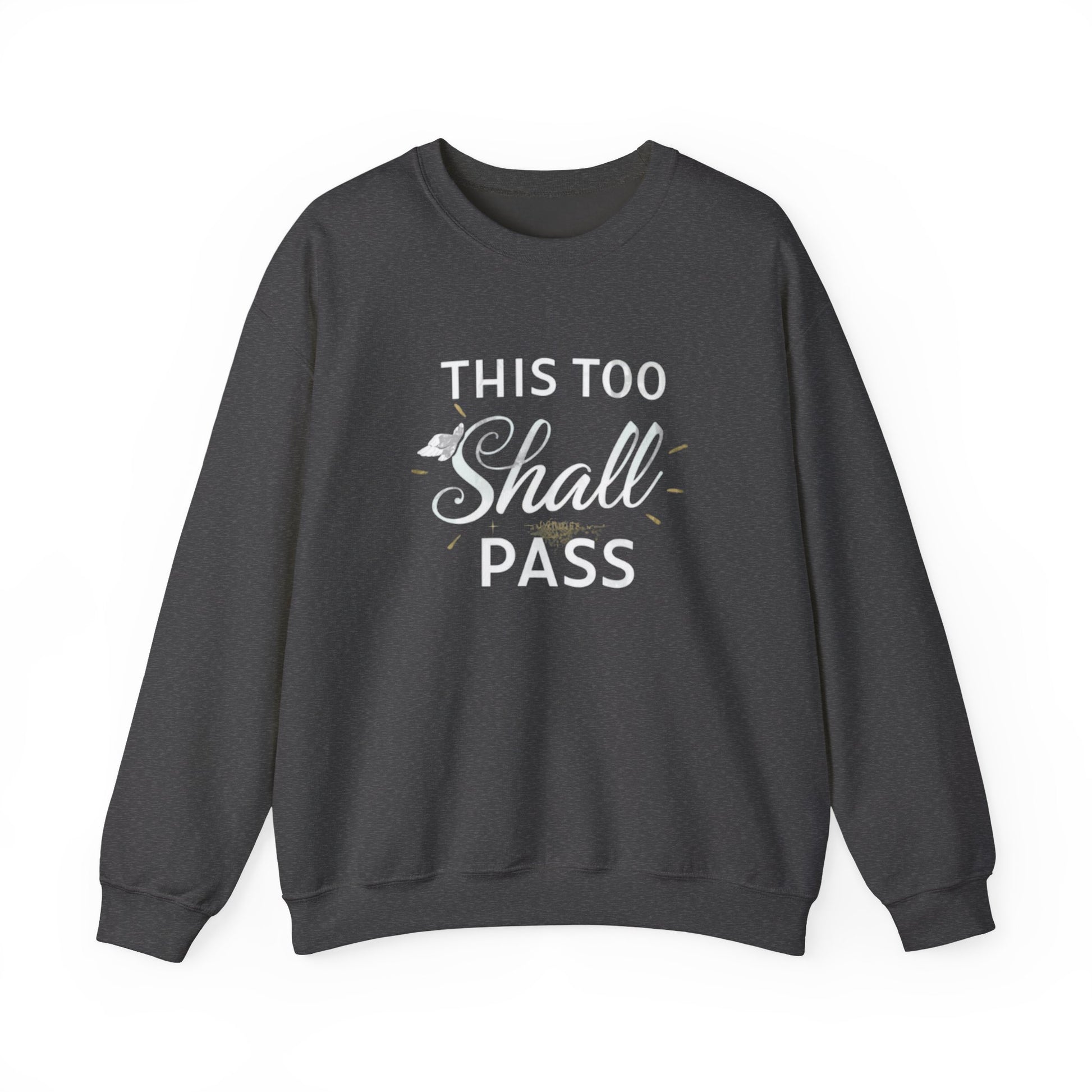 This crewneck sweatshirt is a gentle, wearable sigh. The embroidered phrase “This Too Shall Pass” sits in soft script against a calm black ground, a quiet reminder you can pull on after a long day or on mornings that need slow, steady gentleness. The midweight knit drapes roomily without bulk, with a ribbed collar that keeps its shape and double-needle stitching that stands up to everyday life. Choose left, centre,