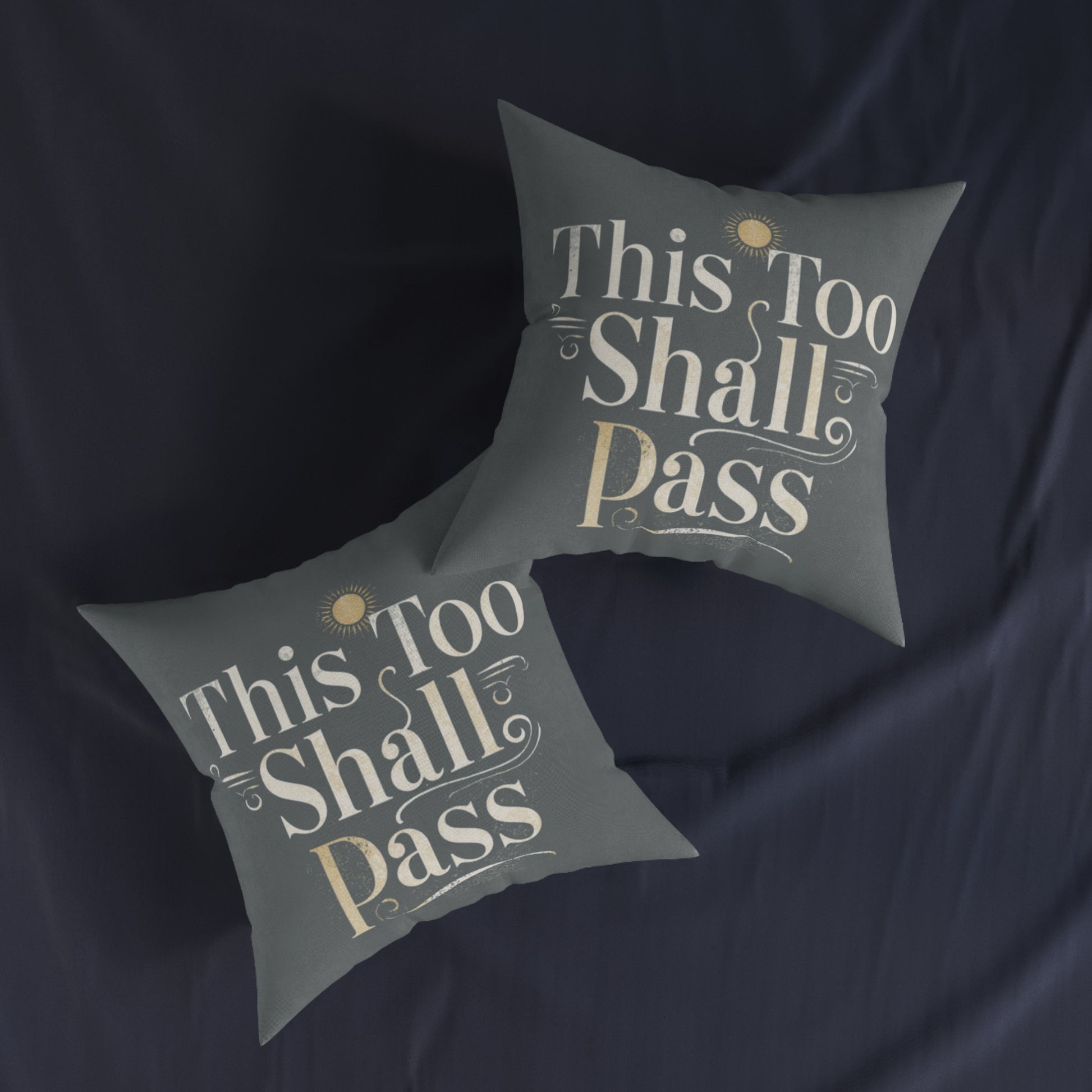 This square pillow is a quiet, comforting presence for rooms that need a soft word. The muted charcoal background with warm cream, hand-lettered text reads “This Too Shall Pass”, like a gentle friend at the edge of a difficult evening. Plush faux suede wraps a fluffy polyester insert that invites leaning in,