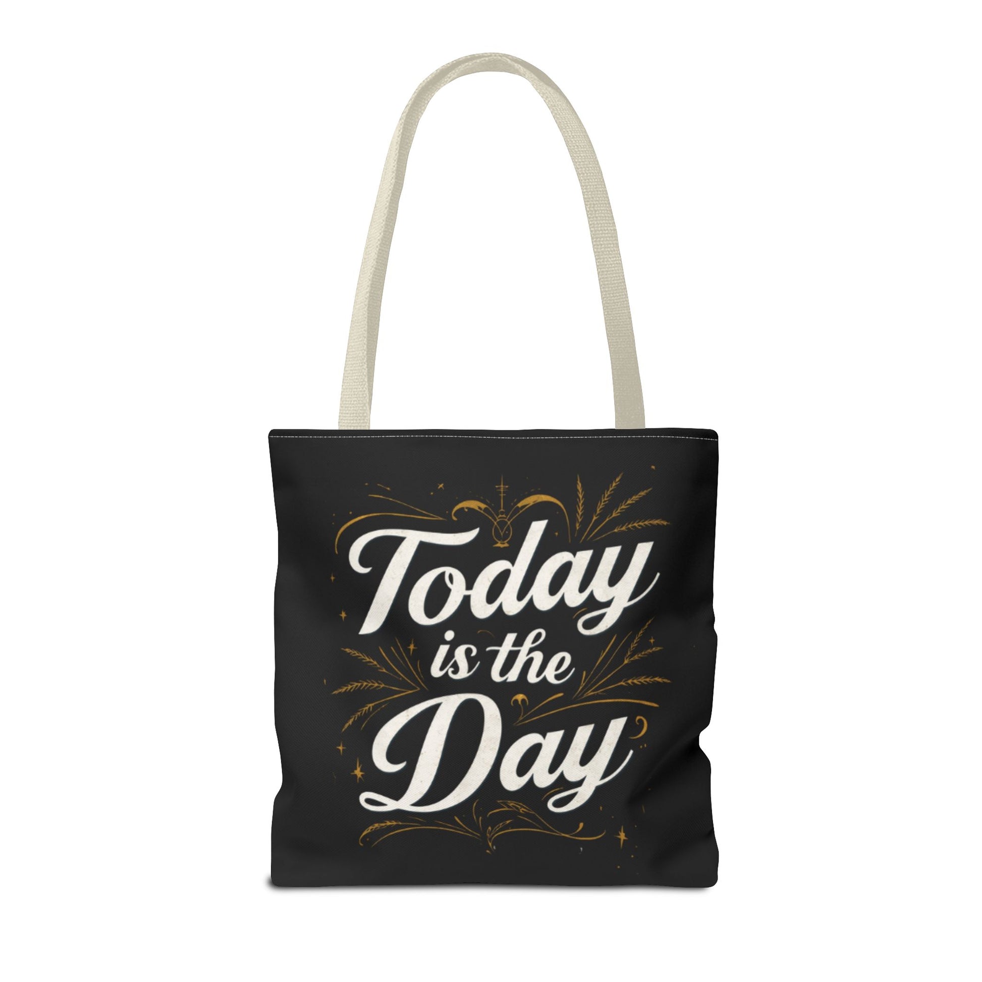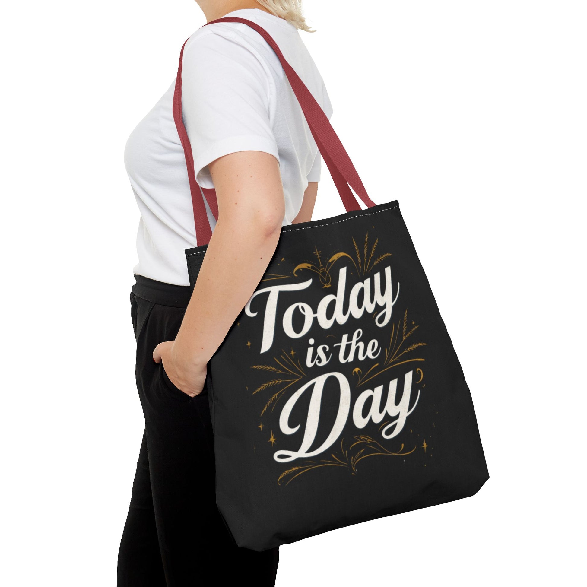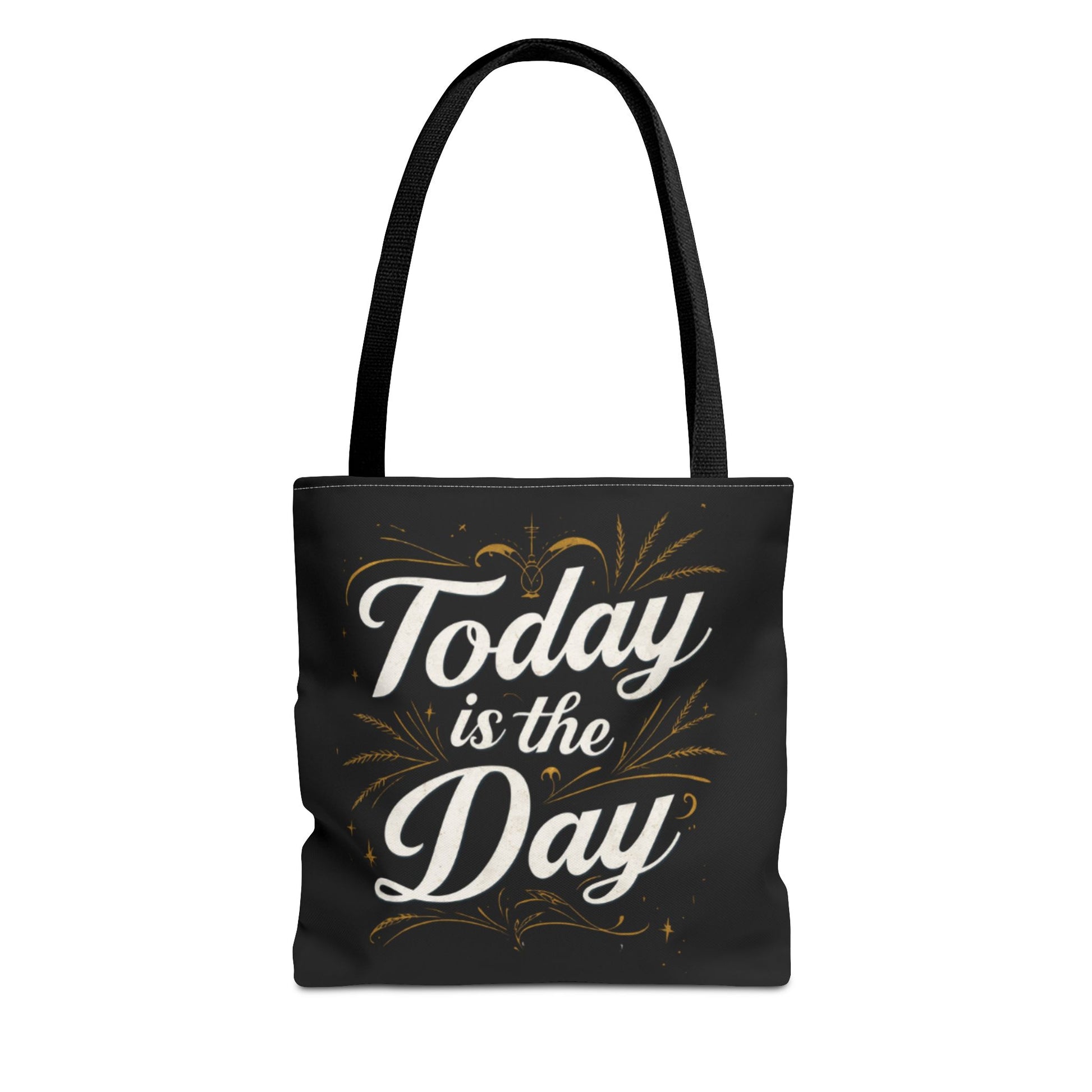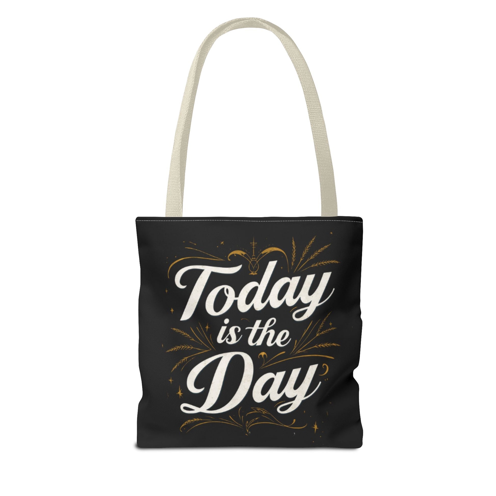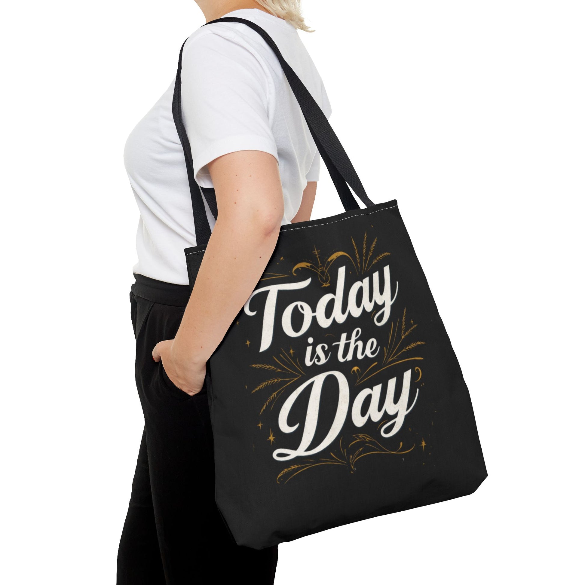 This roomy charcoal tote carries a quiet, confident nudge every time you pick it up. A bold, hand-lettered script reads, "Today is the Day,"