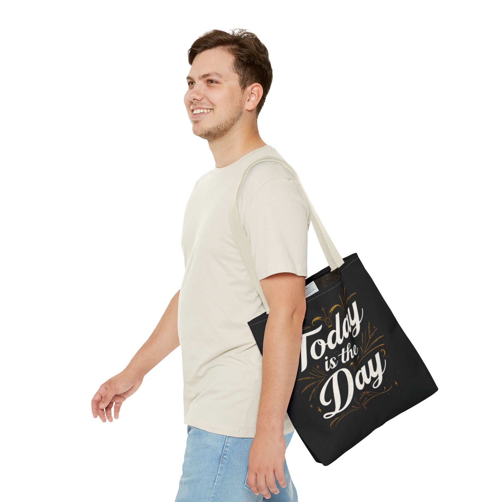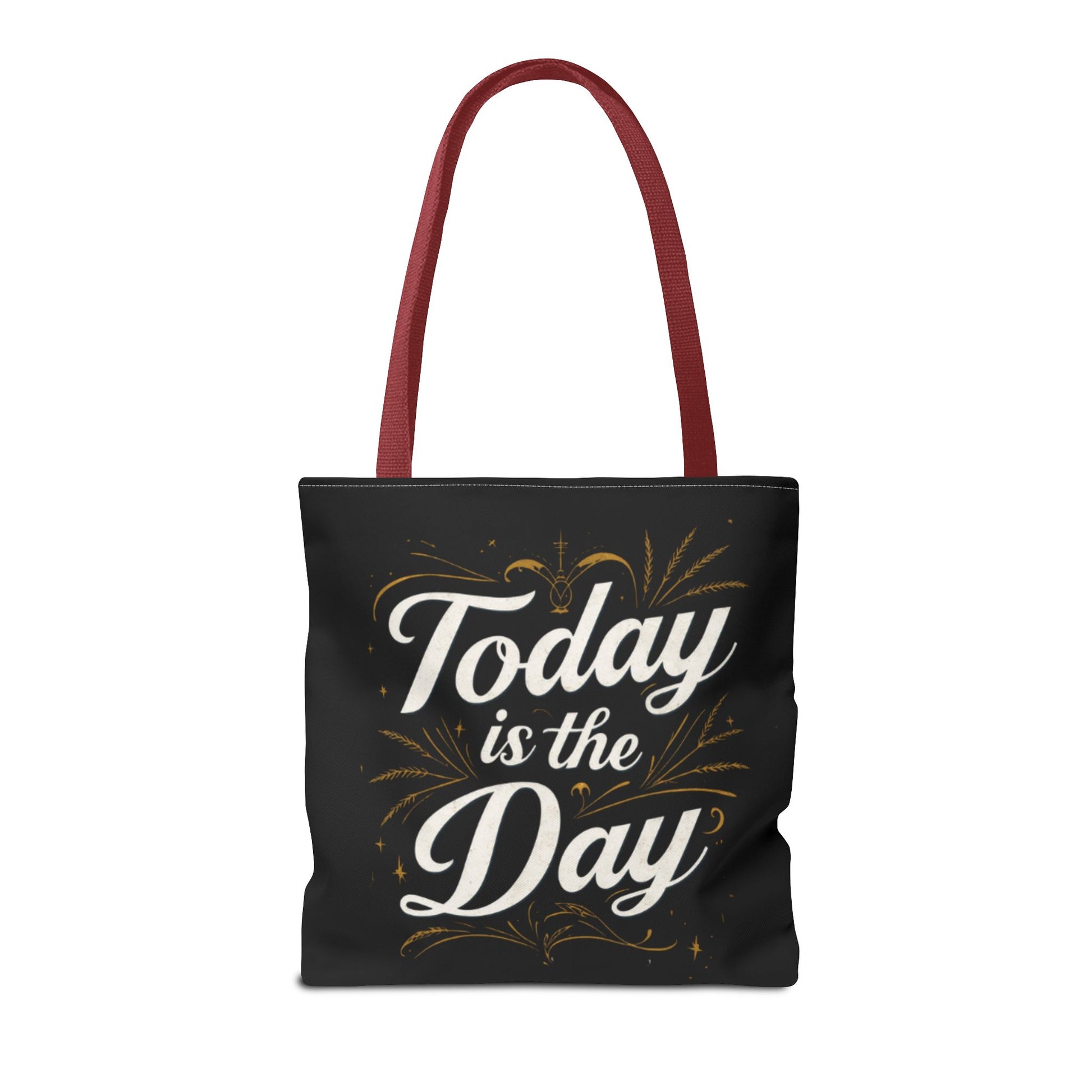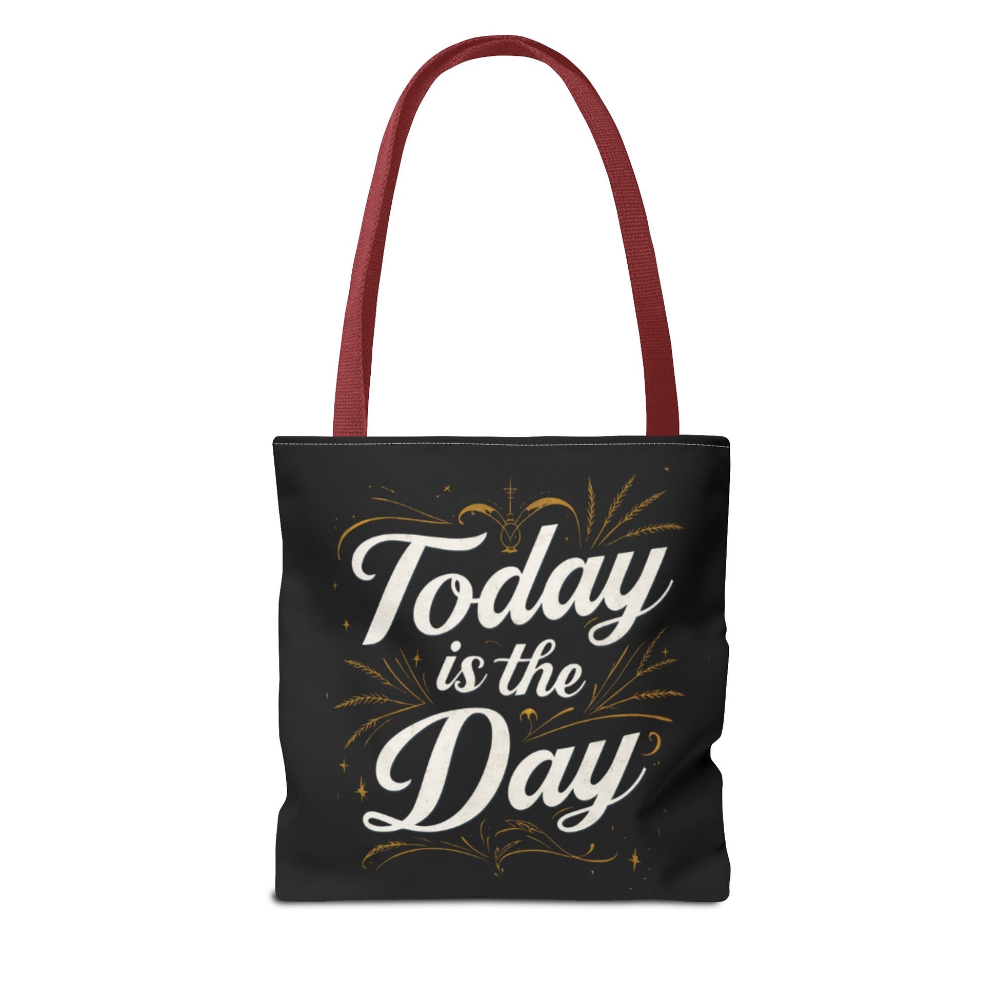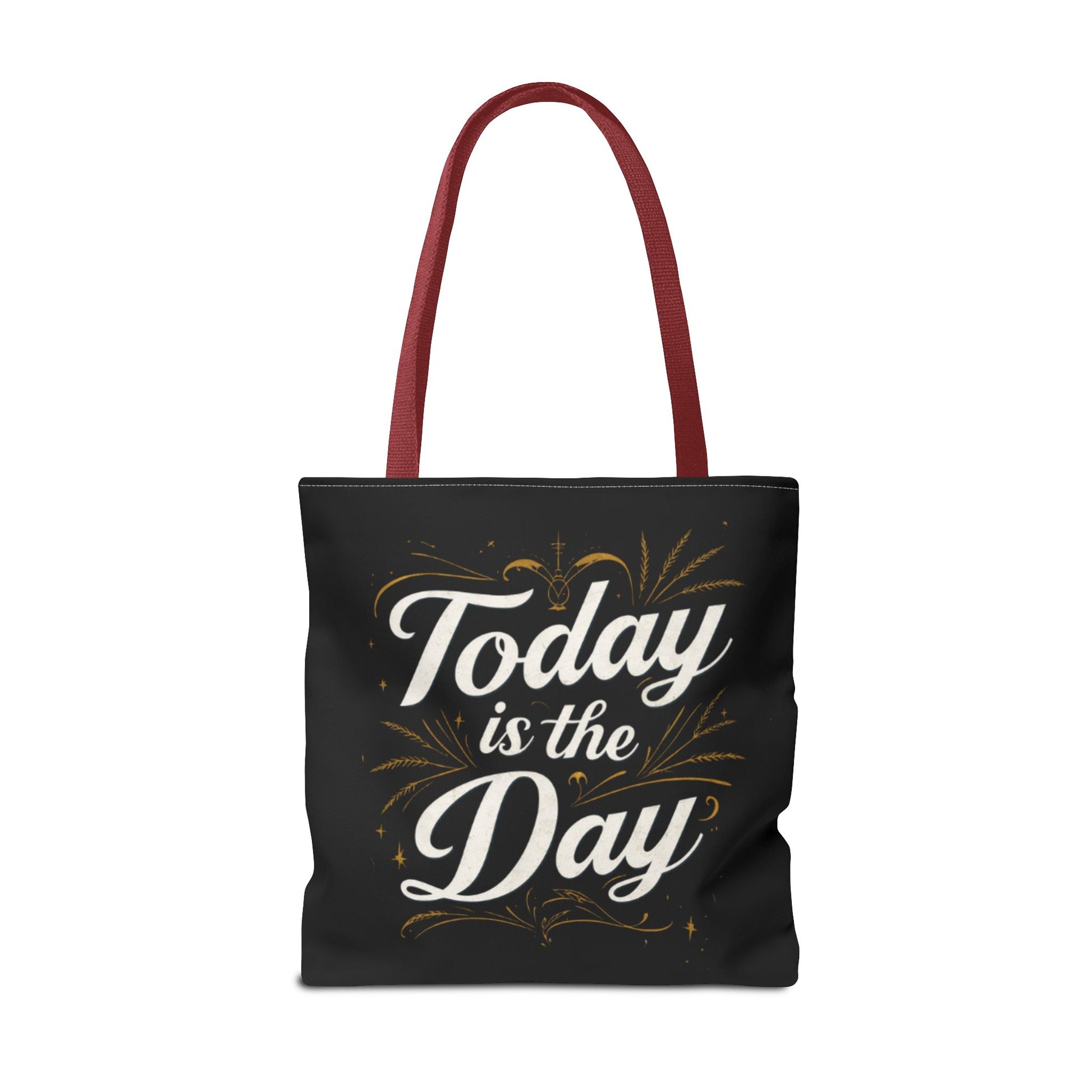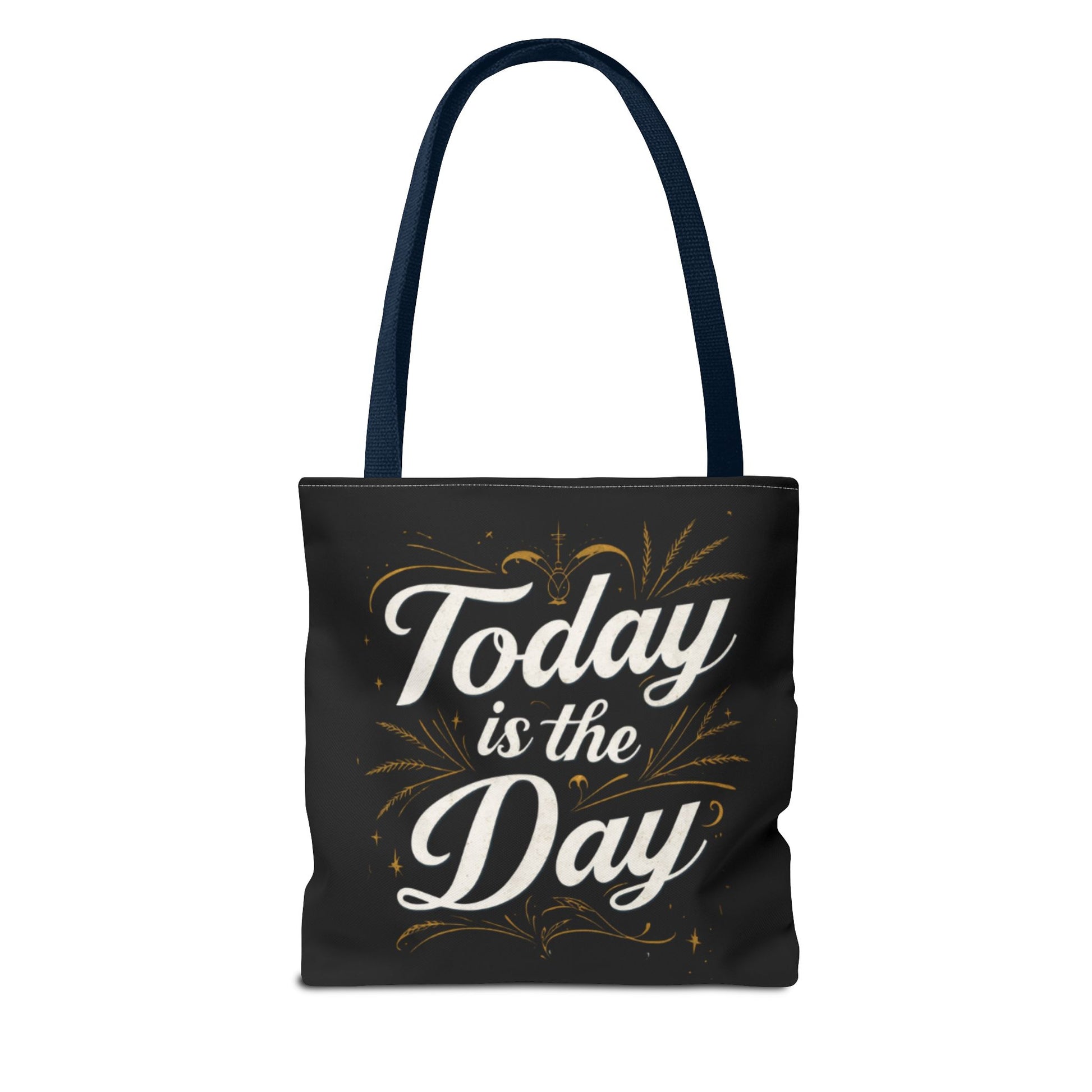This roomy charcoal tote carries a quiet, confident nudge every time you pick it up. A bold, hand-lettered script reads, "Today is the Day,"